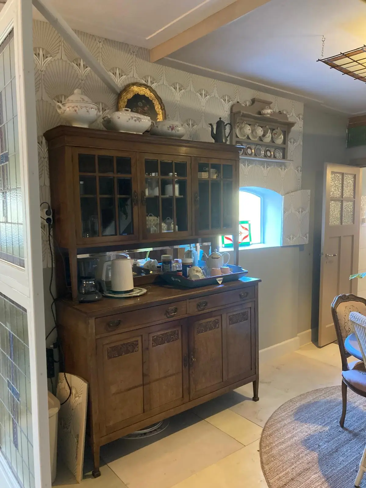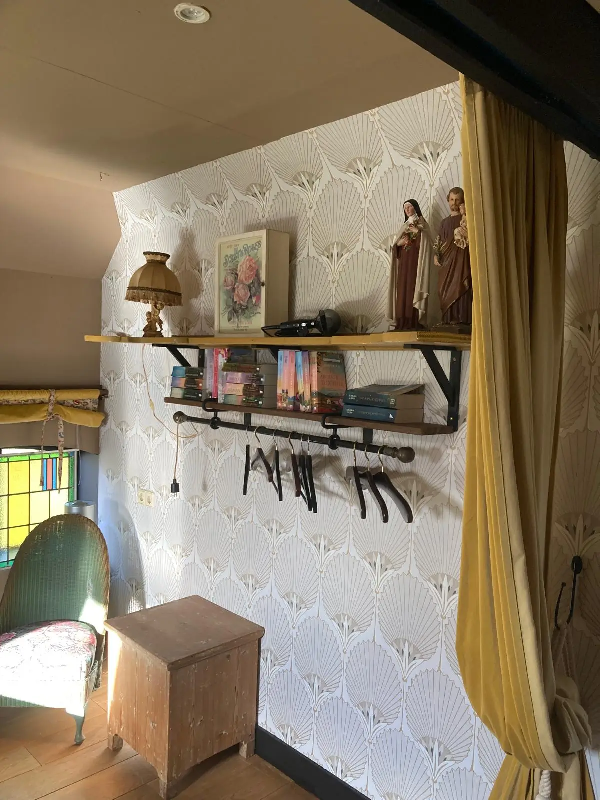 B&B mevrouw Foeks is een bijzondere plek. Zo goed als alles wat je ziet, waar je op zit/ligt, of waar je uit drinkt is tweedehands. En tweedehands in de breedste zin van het woord; afkomstig uit een erfenis, gekregen van vrienden of familie, afkomstig uit een Brocanterie in Nederland of Frankrijk, gevonden in de Kringloopwinkel of op Marktplaats. Ondanks dat het is ingericht met oud & tweedehands meubilair heeft het wel de luxe van een goed bed en een lekkere douche. Koud is het ook niet, met de pelletkachel stook je het snel lekker warm. Je kunt zelf koffie en theezetten, er staat een klein koelkastje en er is een magnetron.